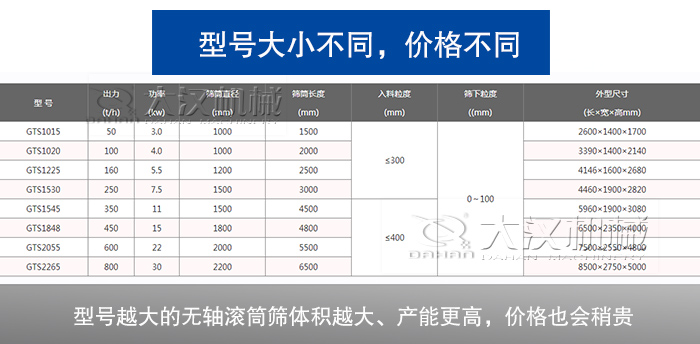 該設(shè)備型號有多種,每種型號的設(shè)備機(jī)重、體積、效率、產(chǎn)能、電機(jī)功率等各不一樣,型號越大的無軸滾筒篩體積越大、產(chǎn)能更高,價(jià)格也會(huì)稍貴些,不過給客戶帶來的經(jīng)濟(jì)利潤將會(huì)更顯著;反之,型號小的無軸滾筒篩價(jià)格低,適合于小規(guī)模企業(yè),效益較大型號設(shè)備低些。