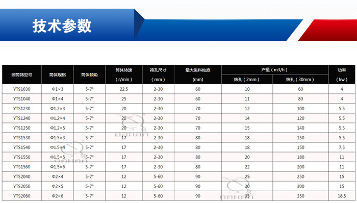 圓筒回轉篩主要是由動力組件、粗料出料口、上密封殼、篩筒、篩下物出料口、擋料板、進料口、支架等部分組成的。滾筒篩通過變速減速系統使篩分筒在一定轉速下旋轉,其分級級數一般從細到粗為1-4節,物料自上而下通過篩分筒得到粉粒,細料從篩分筒前端下部排出,粗料從篩分筒下端尾部排出,實現物料分級目的。