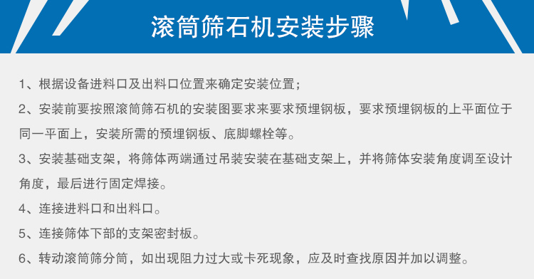 2、安裝前要按照滾筒篩石機(jī)的安裝圖要求來要求預(yù)埋鋼板,要求預(yù)埋鋼板的上平面位于同一平面上,安裝所需的預(yù)埋鋼板、底腳螺栓等。