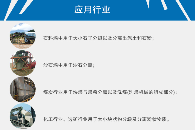 化工行業、選礦行業用于大小塊狀物分級及分離粉狀物質。