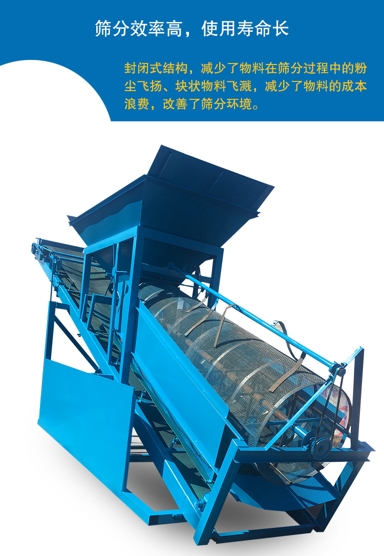 小型滾筒篩沙機主要用于中、細碎物料的分級篩選,按照不同的分級要求,從粗到細依次分為1-4節,物料從細導出依次篩分,大于篩孔尺寸的物料排出,篩面呈傾斜安裝,外部被密封隔離罩所隔離,可避免物料轉載篩分過程中出現的粉塵飛揚。