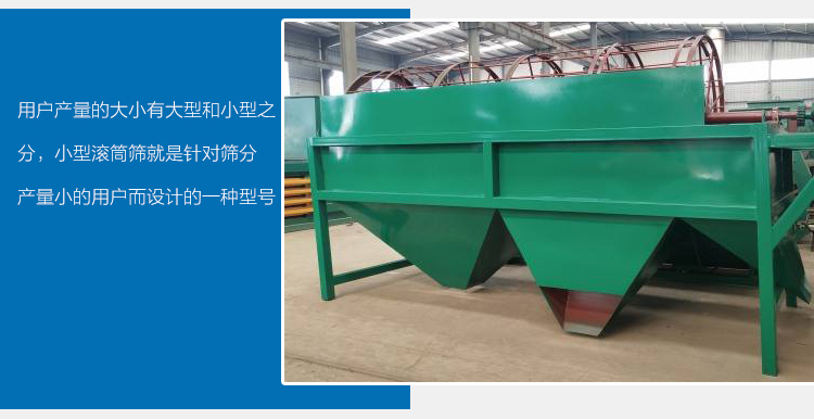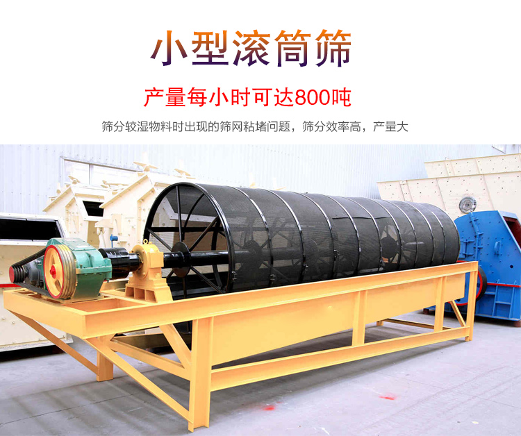 小型滾筒篩利用機械方法,通過數片并列的篩條構成篩孔并形成篩面。篩筒旋轉利用物料的自重進行篩分,破碎的石料進入滾筒后,靠滾筒旋轉的離心力及跳汰作用來篩分物料。通過不同網目的篩網逐一篩出。不同規格的石料篩出后經漏斗落入皮帶機送至成品料場。靠滾筒旋轉的離心力及跳汰作用來篩分物料,通過不同網目的的篩網逐漸被篩出。