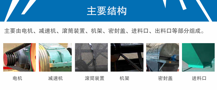 小型滾筒篩主要由電機、減速機、滾筒裝置、機架、密封蓋、進料口、出料口等部分組成。