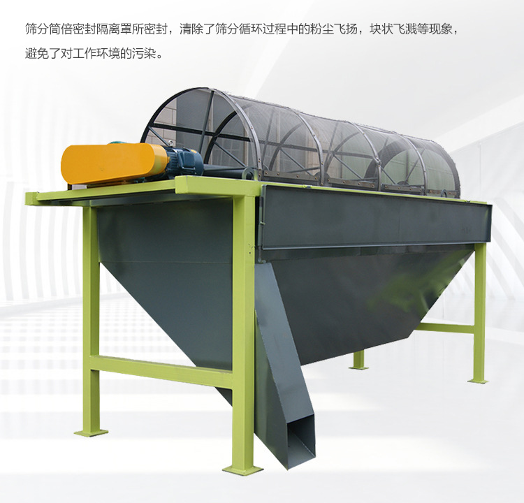 主體結構是篩分筒,它是由若干個圓形狀篩網組成,整體與地平面成傾斜狀態,外部被密封隔離罩所密封,以防止污染環境。電動機經減速器與滾筒裝置通過聯軸器連接在一起,驅動滾筒裝置繞其軸線轉動,物料自上而下通過篩分筒分離,細料從篩分筒前端下部排出,粗料從篩分筒下端尾部排出。
