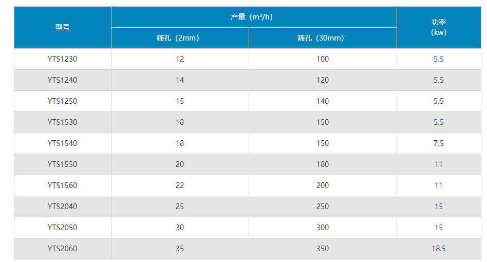 YTS1230小型滾筒篩  篩體規格φ1*3,篩體傾角5°-7°,筒體轉速22.5轉/分,進料粒度60mm,產量為10-60噸/時。