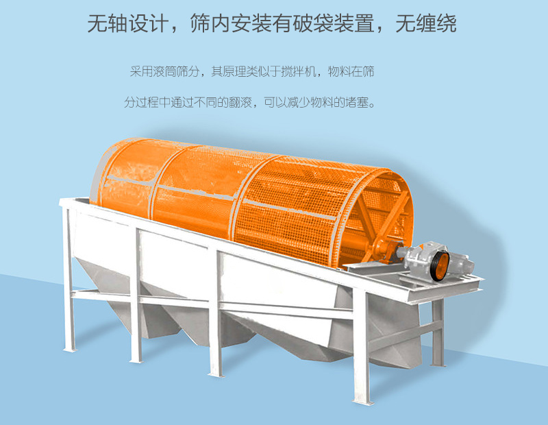 1、無軸設計,篩內安裝有破袋裝置,無纏繞。