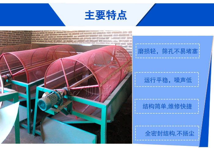 1、采用滾動(dòng)輸送原理,摩擦系數(shù)小,磨損輕,篩孔不易堵塞。